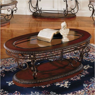 21255 Features: -Oval cocktail table. -Crescendo collection. -Wood finish: Dark brown leather. -Steel finish: Antique burnished bronze. -Wood and steel construction. -Contains some plastic parts. -Detailed dental molding pattern imprinted on the base and table tops. -Thick beveled glass insert on the tops. -Care: Surfaces clean easily with a soft cloth. -General conformity certified. -Assembly required. -Manufacturer provides 1 year warranty. Read more...