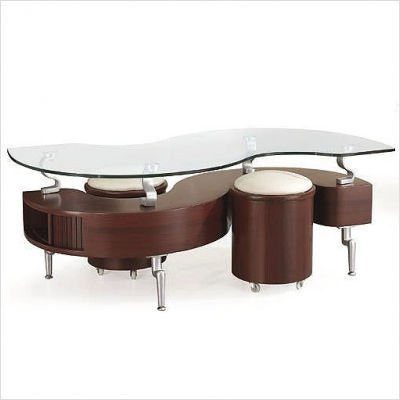 288MC This coffee table can serve many different functions. Used for morning coffee and a newspaper or cocktails with friends, this serpentine table with two matched rolling stools is sure to draw some attention. Pair with the 288ME model table (sold separately) to complete this unique set. Features: -S-curved ''floating'' glass surface with metal supports -Mahogany finish S-curve base with sliding storage space -Decorative metal legs -Two matching rolling stools with white upholstered seat -Additional coordinating table available (sold separately) -Available separately in High Gloss Cherry, High Gloss Mahogony, High Gloss Wenge, Matte Natural, and Matte Black finish -Dimensions: 23'' H X 54'' W X 28'' D Read more...