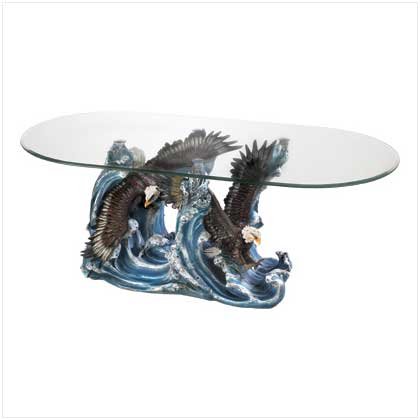 Don't settle for ordinary boring furniture; enjoy a work of art instead! Stunning sculpture accent table depicts a pair of eagles in majestic flight, gliding over stormy seas; a clear glass top allows you to enjoy every gorgeous detail. Weight 35 lbs. Polyresin base with clear tempered glass top. 35 3/4" x 19" x 18" high. Read more...