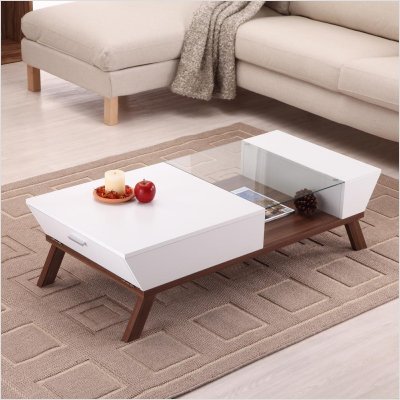 YNJ-913CT-WHT Finish: White Pictured in White With a rectangular profile and gently flared legs, this beautifully crafted coffee table has a graceful silhouette that's matched with incredible durability. Features: -Coffee table. -Available in white or walnut finish. -Constructed of wood, medium fiber board and strength enhancing veneers. -Glass top construction. -Modern style. -Work well in small spaces with a mix of colors and patterns. -Open shelf below. -With drop down side panels with interior storage space. -ISTA 3A certified. -Assembly required. Read more...