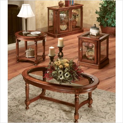 Bordeaux Oval Cocktail Table Set Series Set Includes Cocktail Table and one End Table What is Included: - Set includes (1) Bordeaux Oval Cocktail Table in Bordeax Cherry, and (1) Bordeaux Oval End Table in Bordeaux Cherry . This Oval Cocktail Table Set by Bordeaux Collection would be the perfect gist for your living room! Make an encouraging place to spend your time with your family after a long busy day. Made of hardwood solids and cherry veneers with a classy glass top. Set includes oval end table, console table and curio, chairside table and curio, end table, chairside table and sofa table. Luxurious yet absolutely excellent furniture for your interior! Features: -Bordeaux Cherry finish. -Constructed of cherry veneers and select solid hardwoods. -Glass table tops are bronzed beveled glass. -Chairside Table has one bottom drawer. -Chairside Table and Curio has one glass door. -Console Table and Curio has two glass doors. -End Table has one bottom drawer. -Sofa Table has two bottom drawers. Dimensions: -Chairside Table Overall Dimensions: 23'' H x 15'' W x 25'' D. -Chairside Table/Curio Overall Dimensions: 23'' H x 20'' W x 20'' D. -Oval Cocktail Table Overall Dimensions: 19'' H x 46'' W x 28'' D. -Console Table/Curio Overall Dimensions: 30'' H x 40'' W x 14'' D. -End Table Overall Dimensions: 23'' H x 22'' W x 27'' D. -Oval End Table Overall Dimensions: 23'' H x 22'' W x 26'' D. -Sofa Table Overall Dimensions: 30'' H x 46'' W x 16'' D. Read more...