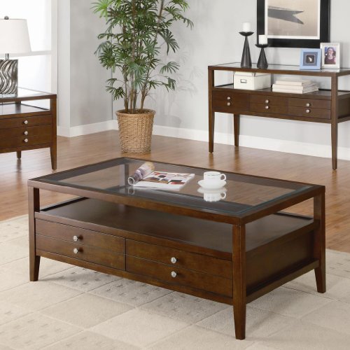 COFFEE TABLE features a glass top insert with 2 drawers in a coffee brown finish Read more...