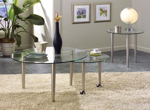 The best contemporary designs boast provocative contrasts that bring any space to life. The Galaxy Contemporary Cocktail Table and End Table, featuring a mobile shelf underneath is sure to exceed those expectations. With its glass table top metal finish, this contemporary table collection is versatile enough to match any decor. Features: Contemporary style Champagne finish Round glass top Mobile swing out glass table Modern designMetal base Specifications: Overall dimensions: 20H x 36D x 36W inches Weight: 56 lbs. Read more...
